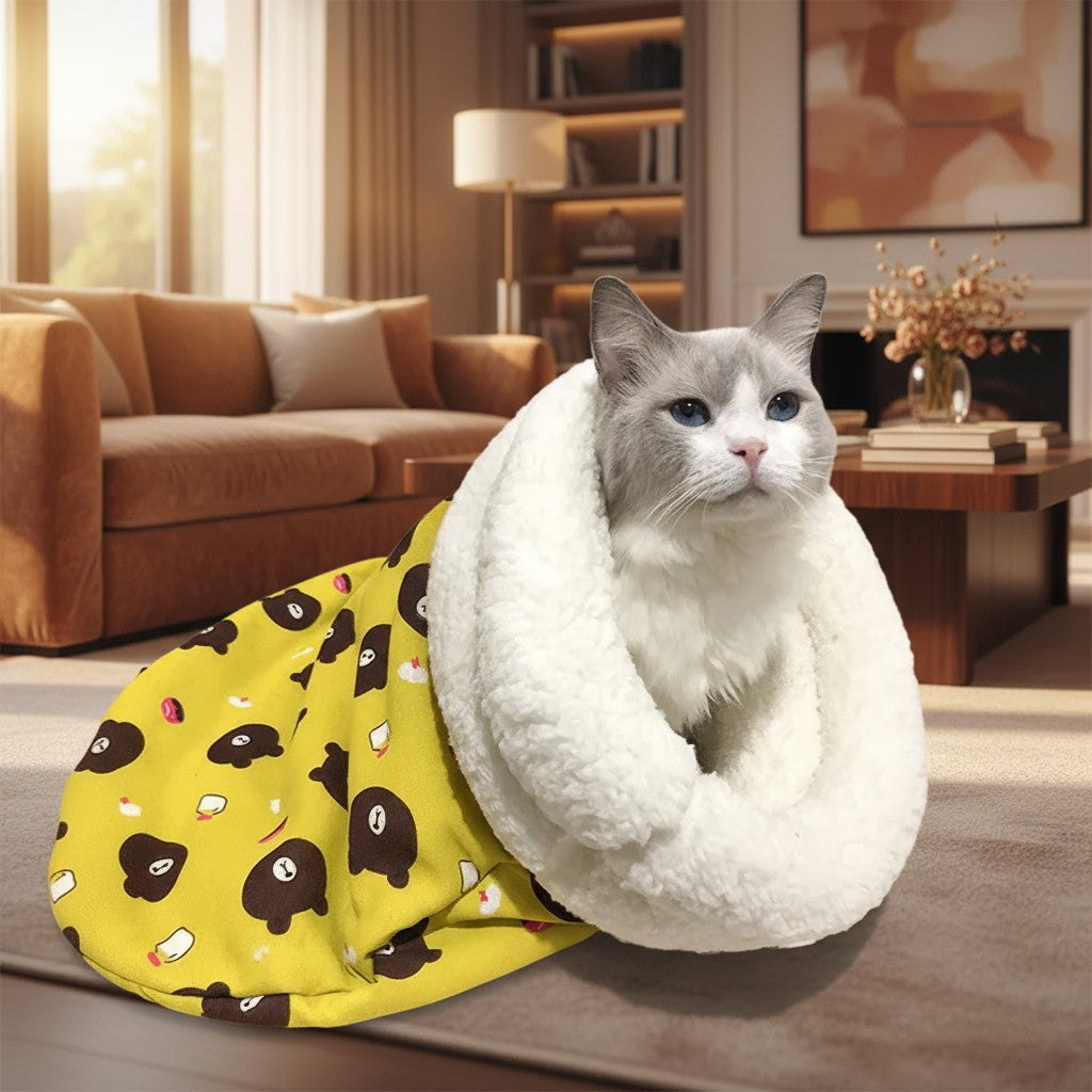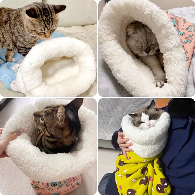 Con este saco, se mantiene cálido y acogido, ¡y hasta ronronea mientras duerme!